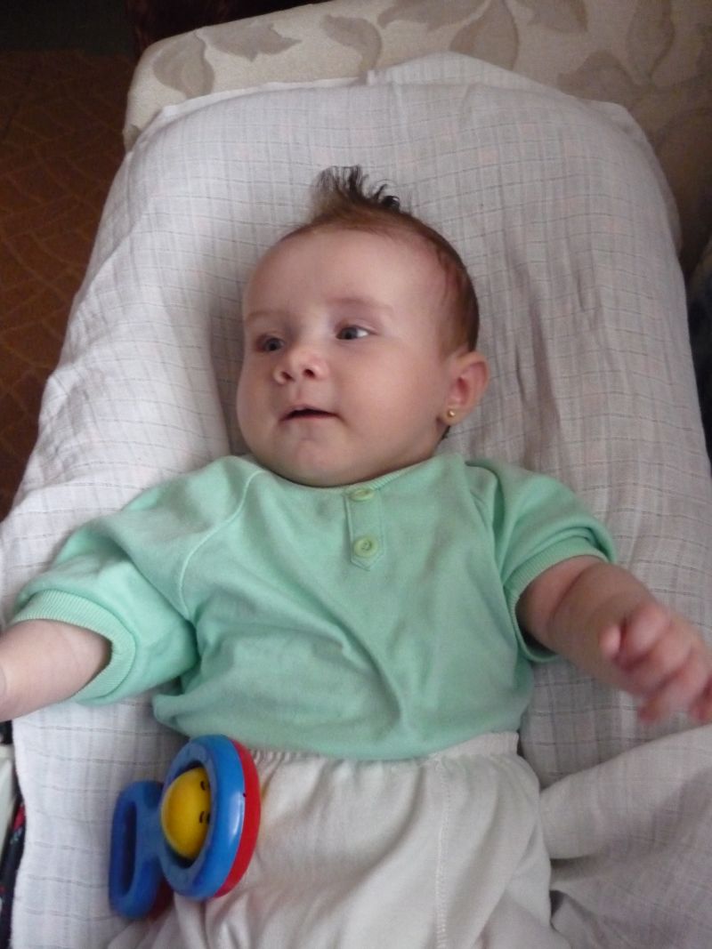 Krásně si hraješ, směješ se a poskakuješ na nožičkách...asi budeš dříve chodit než sedět :) Paseš "koně", přetáčíš se....a hlavně máš krásně oči. Snad ti vydrží.