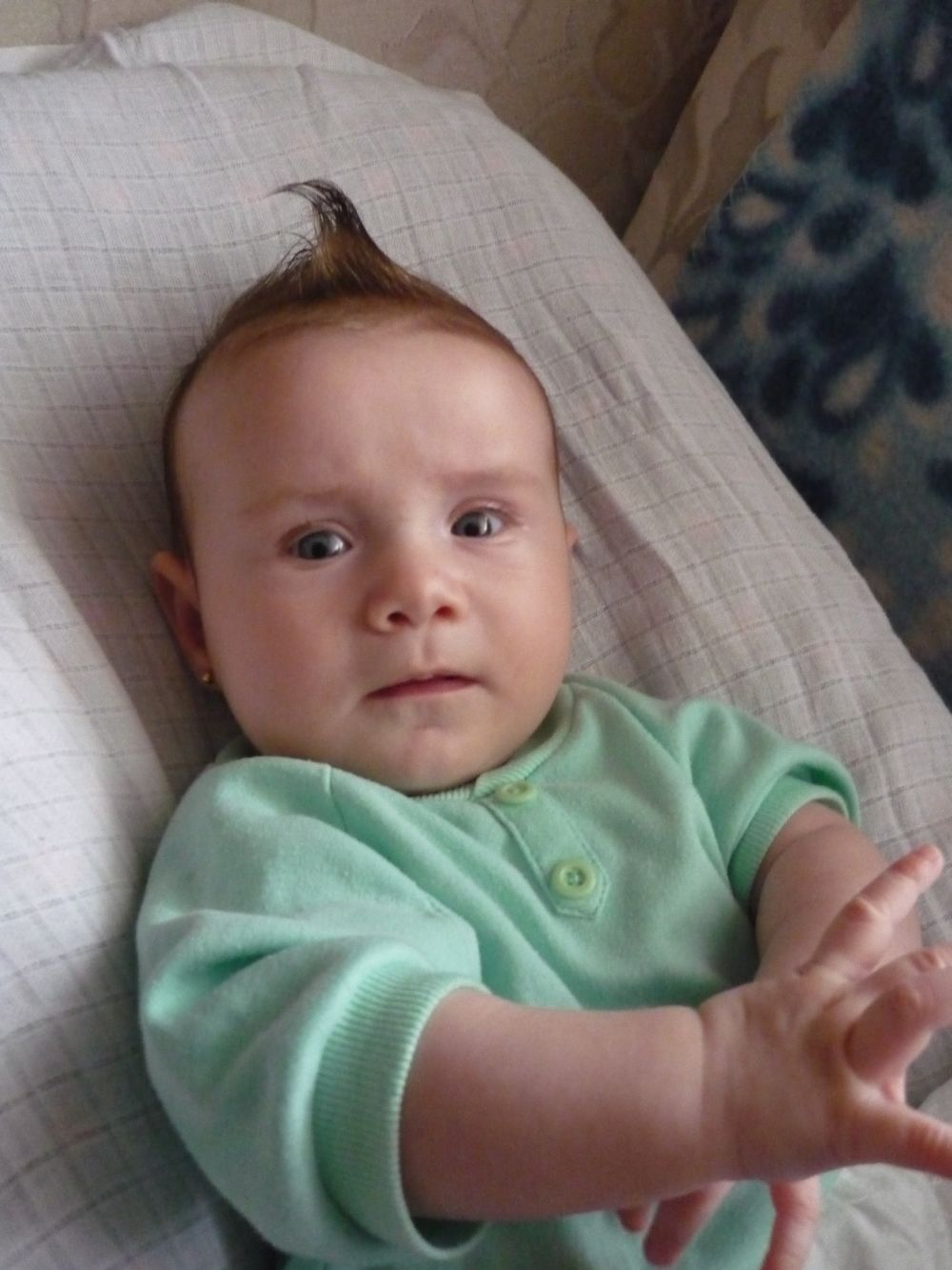 2.července tak dnes ti udělali ti tvoji rodičové dírky do oušek. No, samozřejmě se to neobešlo bez zmatků. Nejdříve tvoje babička vymýšlela, jak to "udělá" sestřička z nemocnice, pak to měl být doktor....a nakonec ti ty dírky nastřelili v kadeřnictví Salon Jarmila. Vše proběhlo velmi rychle, ani slzička - prostě klídek. Tvoje nášničky, ty pravé od babičky dostaneš později - teď tam máš nějaké pecičky. Pokud by tě zajímala cena...snad 300Kč včetně peciček. Přesně to ale nevím :(